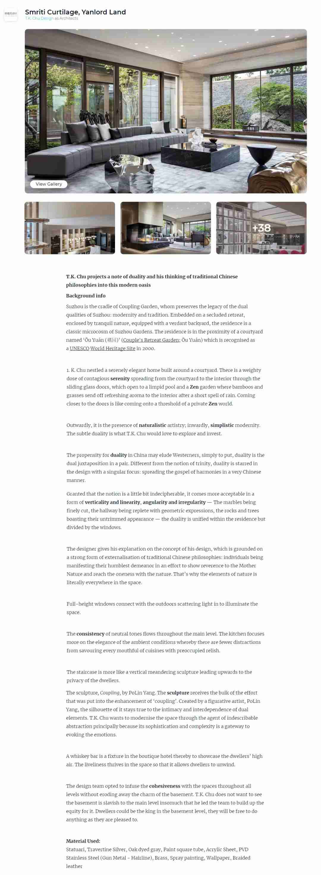 耦前別墅項(xiàng)目中,邱德光設(shè)計(jì)將東方的“天人合一”化作設(shè)計(jì)的“關(guān)系美學(xué)”。根植于文化,進(jìn)而超越文化,觸達(dá)人的感受、啟發(fā)內(nèi)在的覺知。近日,項(xiàng)目收獲《domus China》、《Architecture Art Designs》、《Architect》等國際知名學(xué)術(shù)雜志及設(shè)計(jì)媒體的關(guān)注報(bào)道,并被翻譯為英語、荷蘭語等多國語言。